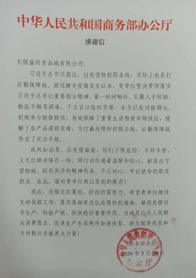 “在疫情面前,你們不懼危險(xiǎn)、不辭辛勞,義無反顧沖鋒在一線,用行動(dòng)傳遞著溫暖和信心,彰顯出守望相助、同舟共濟(jì)的精神傳承,不忘初心、牢記使命的職責(zé)擔(dān)當(dāng)?!?020年5月20日盛陽食品城收到了中華人民共和國商務(wù)部辦公廳的感謝信,這對(duì)我們來說這是一份崇高的榮譽(yù)。我們將繼續(xù)落實(shí)做細(xì)常態(tài)化疫情防控措施,繼續(xù)銜接產(chǎn)銷、保供穩(wěn)價(jià),滿足廣大人民群眾的消費(fèi)需求,促進(jìn)生產(chǎn)生活秩序加快恢復(fù)、為助力脫貧攻堅(jiān)和鄉(xiāng)村振興作出更大的貢獻(xiàn)。