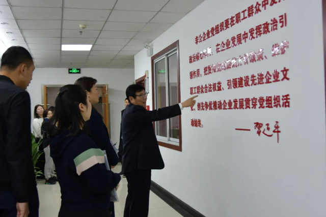 交流會開始之前,華書記首先帶領(lǐng)導(dǎo)參觀了企業(yè)文化宣傳長廊,介紹了公司的發(fā)展理念,并一一介紹了企業(yè)歷年來活動的精彩瞬間和所獲得的的相關(guān)榮譽(yù);在黨員活動室,華書記逐一介紹了黨支部在非公企業(yè)的黨建開展情況,并結(jié)合展板,詳細(xì)介紹了盛陽食品城黨支部黨員掛鉤服務(wù)一線開展的具體工作。公司通過“黨建帶工建”、“黨建帶群建”,在市場與商戶的合作關(guān)系中起到了重要的協(xié)調(diào)作用。周燕燕同志也對盛陽黨支部的工作給予了肯定,她表示,一個(gè)企業(yè)黨建工作是否落到實(shí)處,關(guān)鍵要看企業(yè)的黨建工作是否能促進(jìn)企業(yè)經(jīng)濟(jì)效益乃至促進(jìn)社會效益,盛陽黨支部,把黨建工作落到了實(shí)處。面對市場形形色色、素質(zhì)層次不一的基層人員,很好地協(xié)調(diào)起來,也是為社會和諧夯實(shí)了基礎(chǔ)。隨后華總又帶領(lǐng)領(lǐng)導(dǎo)們參觀了企業(yè)發(fā)展歷程長廊、盛陽禮約墻、黨群健身房、心理疏導(dǎo)室、盛陽易鮮達(dá)項(xiàng)目組等。在隨后的驗(yàn)收過程中,盛陽黨支部還向驗(yàn)收小組提供了黨支部臺賬,驗(yàn)收人員表示,臺賬全面、內(nèi)容具體、流程合規(guī)。