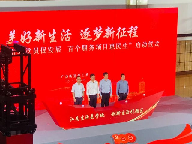 第三篇章——美好廣益,百尺桿頭?;顒?dòng)現(xiàn)場(chǎng)通過視頻,介紹了“百名市場(chǎng)黨員促發(fā)展 百個(gè)服務(wù)項(xiàng)目惠民生”雙百工程的情況,由各支部的黨員代表上臺(tái)認(rèn)領(lǐng)“雙百工程”。最后,由廣益街道黨工委領(lǐng)導(dǎo)和各區(qū)委領(lǐng)導(dǎo)共同上臺(tái)完成了“雙百工程”的啟動(dòng)儀式。