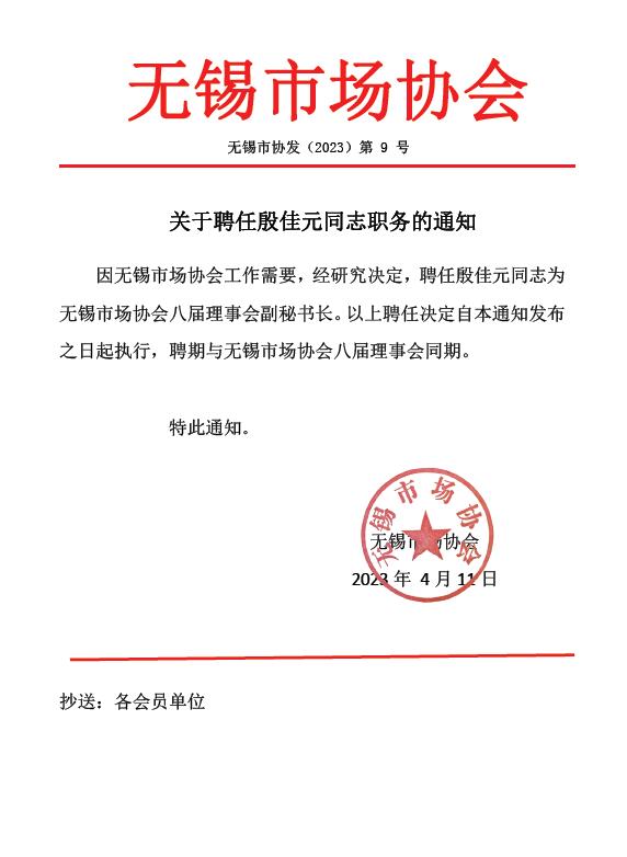 無錫市協(xié)發(fā)【2023】第9號無錫市場協(xié)會關(guān)于聘任殷佳元同志職務(wù)的通知