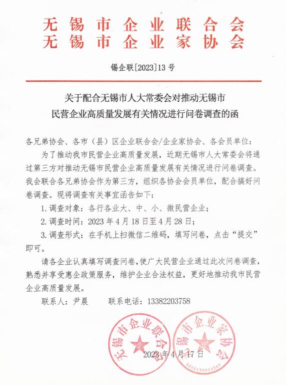 配合市人大對推動無錫市民營企業(yè)高質(zhì)量發(fā)展情況進行問卷調(diào)查的函