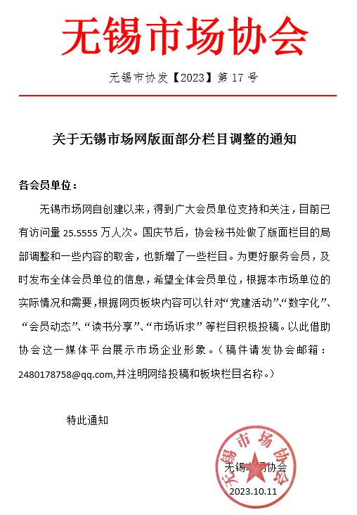 無錫市協(xié)發(fā)【2023】第17號關(guān)于無錫市場網(wǎng)版面部分欄目調(diào)整的通知