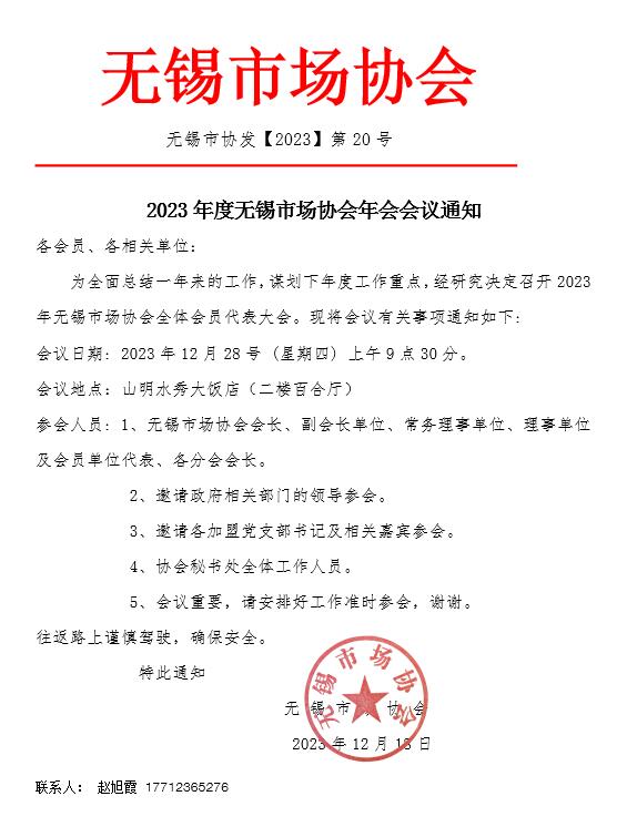 無錫市協(xié)發(fā)【2023】第20號無錫市場協(xié)會年會會議通知