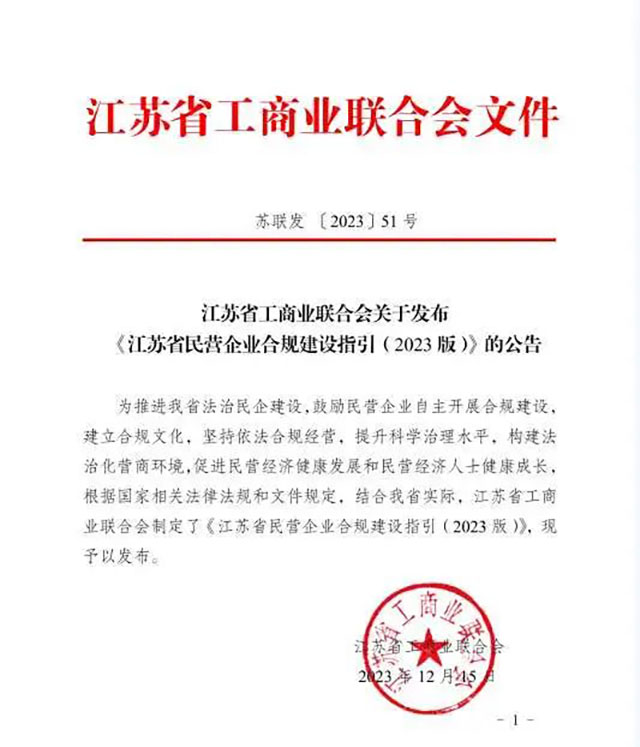 為推進(jìn)我省法治民企建設(shè),鼓勵(lì)民營企業(yè)自主開展合規(guī)建設(shè),江蘇省工商聯(lián)組織專業(yè)力量,根據(jù)國家相關(guān)法律法規(guī)和文件規(guī)定,參照ISO37301:2021《合規(guī)管理體系要求及使用指南》、GB/T35770-2022《合規(guī)管理體系要求及使用指南》、T/CASMES 19-2022《中小企業(yè)合規(guī)管理體系有效性評(píng)價(jià)》等合規(guī)規(guī)則,制定了《江蘇省民營企業(yè)合規(guī)建設(shè)指引(2023版)》,并于2023年12月18日,在江蘇省法治民企建設(shè)推進(jìn)會(huì)上發(fā)布。指引的發(fā)布,旨在引導(dǎo)廣大民營企業(yè)建立合規(guī)文化,堅(jiān)持依法合規(guī)經(jīng)營,提升科學(xué)治理水平,促進(jìn)民營經(jīng)濟(jì)“兩個(gè)健康”。