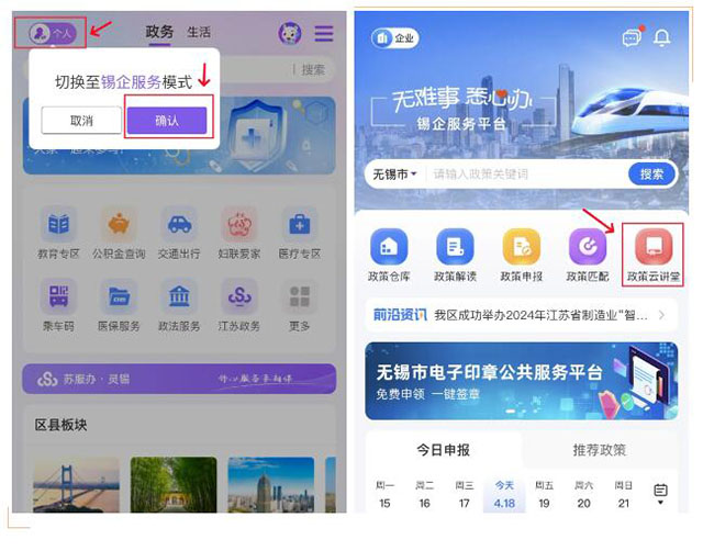 打開靈錫APP,左上角切換至錫企服務(wù)模式,點(diǎn)擊“政策云講堂”。