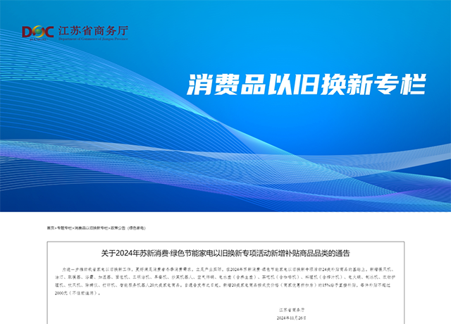 為進(jìn)一步推動(dòng)我省家電以舊換新工作,更好滿足消費(fèi)者冬季消費(fèi)需求,立足產(chǎn)業(yè)實(shí)際,在2024年蘇新消費(fèi)·綠色節(jié)能家電以舊換新專項(xiàng)活動(dòng)24類(lèi)補(bǔ)貼商品的基礎(chǔ)上,新增暖風(fēng)機(jī)、油汀、取暖器、浴霸、加濕器、面包機(jī)、三明治機(jī)、早餐機(jī)、炒菜機(jī)器人、空氣炸鍋、電水壺(含養(yǎng)生壺)、茶吧機(jī)(含咖啡機(jī))、料理機(jī)(含榨汁機(jī))、電火鍋、制冰機(jī)、衣物護(hù)理機(jī)、吹風(fēng)機(jī)、除螨儀、打印機(jī)、智能服務(wù)機(jī)器人20大類(lèi)家電商品。自通告發(fā)布之日起,新增20類(lèi)家電商品按成交價(jià)格(商家優(yōu)惠折扣后)的15%給予直接補(bǔ)貼,每件補(bǔ)貼不超過(guò)2000元(不往前追溯)。