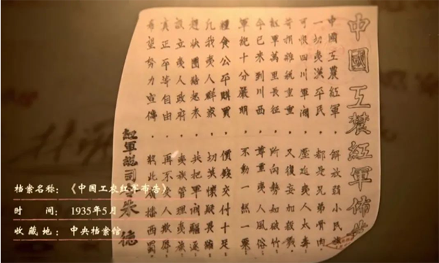 不過(guò),最早使用“長(zhǎng)征”一詞來(lái)稱(chēng)呼紅一方面軍戰(zhàn)略大轉(zhuǎn)移的,是1935年5月在四川省涼山彝族自治州冕寧縣以紅軍總司令朱德名義發(fā)布的《中國(guó)工農(nóng)紅軍布告》。布告全文共156字,以韻律文的形式發(fā)布,其中寫(xiě)道:“紅軍萬(wàn)里長(zhǎng)征,所向勢(shì)如破竹。今已來(lái)到川西,尊重彝人風(fēng)俗。真正平等自由,再不受人欺辱。希望努力宣傳,將此廣播西蜀……”落款是:紅軍總司令朱德。這張布告上沒(méi)有標(biāo)明發(fā)布的具體時(shí)間,但從布告的內(nèi)容可以看出,這是紅軍在進(jìn)入或即將進(jìn)入彝族聚居區(qū)時(shí)發(fā)布的宣傳告示。