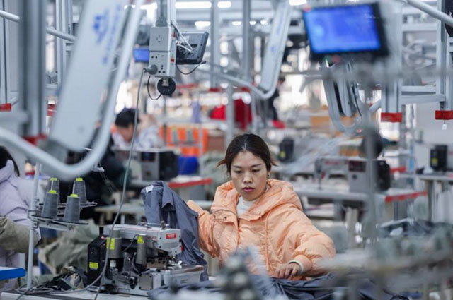 2025年2月26日,在位于織里鎮(zhèn)的湖州今童王制衣有限公司數(shù)字化車間,工人在流水線上加工服裝。該公司是集產(chǎn)品研發(fā)、設計、生產(chǎn)供應鏈管理、市場營銷為一體的綜合性兒童服裝企業(yè),年產(chǎn)銷量達200萬件(套)。新華社記者 徐昱 攝