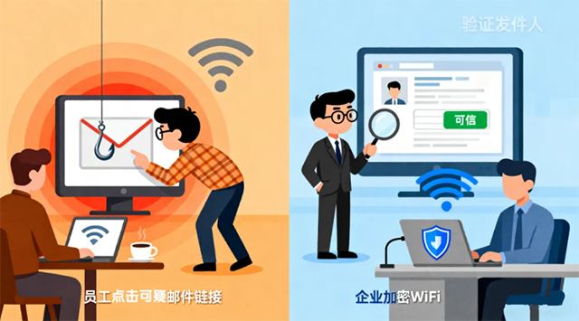 在咖啡廳、機(jī)場(chǎng)等場(chǎng)所,用公共WiFi回復(fù)工作郵件、傳輸客戶數(shù)據(jù),看似方便,實(shí)則相當(dāng)于“把機(jī)密信息放在公共場(chǎng)所”,極易被黑客攔截。