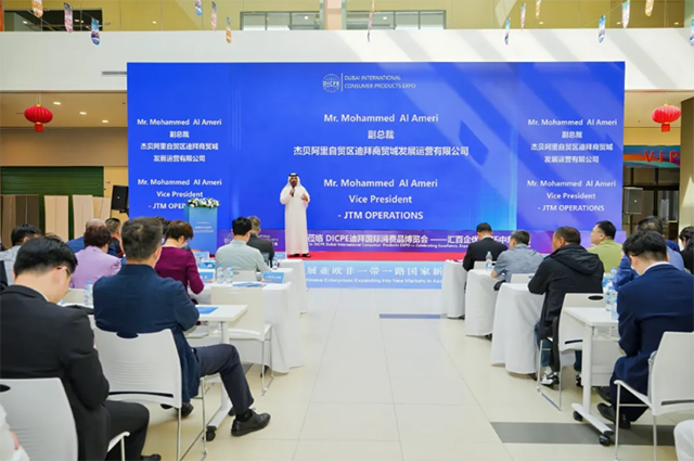 Mr. Mohammed Al Ameri詳細介紹了迪拜義烏市場的運作情況,強調(diào)了其地理環(huán)境優(yōu)勢。迪拜義烏市場地處迪拜優(yōu)越的地理位置,憑借開放的商業(yè)環(huán)境與卓越的全球連通性,為商家和公司提供了巨大的貿(mào)易便利。市場不僅為企業(yè)提供了展示產(chǎn)品、拓展市場的平臺,還提供了豐富的貿(mào)易配對、商務洽談等服務,幫助企業(yè)更好地對接客戶、達成合作。