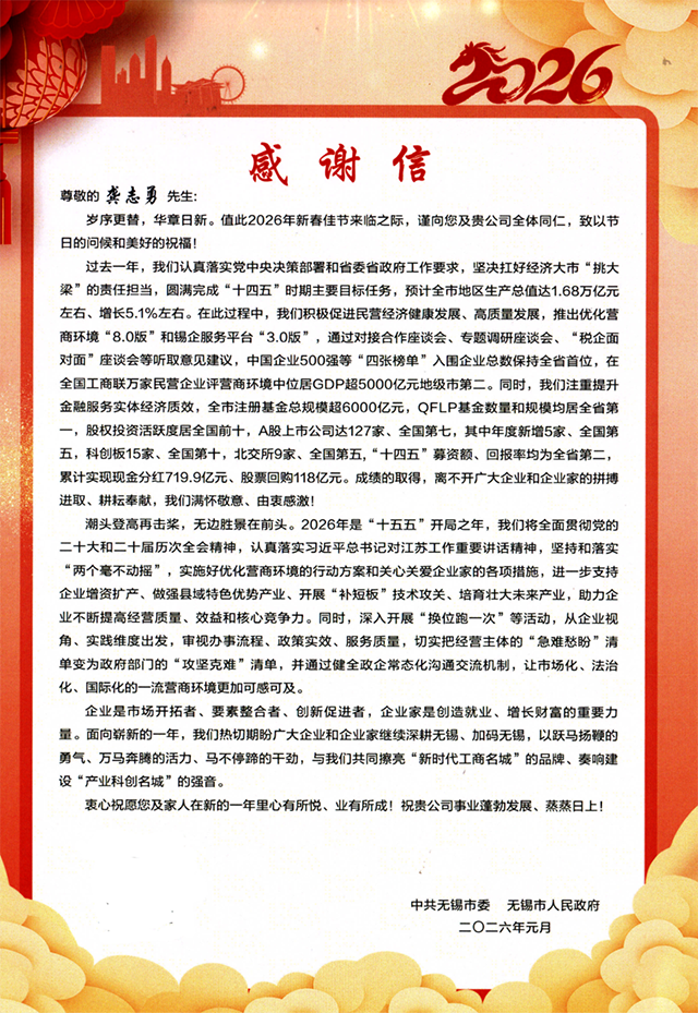 中共無錫市委、無錫市人民政府發(fā)來的一封《感謝信》