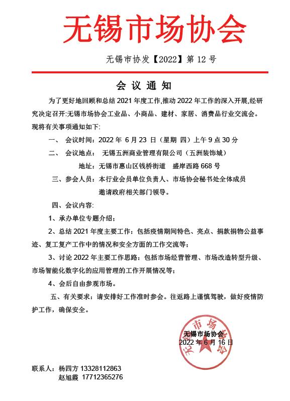 無錫市協(xié)發(fā)【2022】第12號(hào) 工業(yè)品小商品市場(chǎng)行業(yè)交流會(huì)議通知