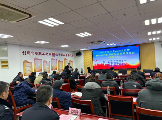 上午9:00,2025年春節(jié)食品安全宣傳暨知識產(chǎn)權(quán)保護服務(wù)前哨推介會(梁溪專場)在盛陽食品城8號樓三樓多功能會議室正式召開。市公安局食藥環(huán)偵支隊副支隊長支炎東、三大隊吳非、錢赟、程悅;梁溪公安分局副局長王大榮、食藥環(huán)偵大隊孫磊、尤震宇;區(qū)市場監(jiān)管局食品經(jīng)營科副科長王翔;盛陽常務(wù)副總?cè)A曙東、食品安全總監(jiān)馮敏,24位市場商戶代表等參加會議。