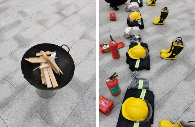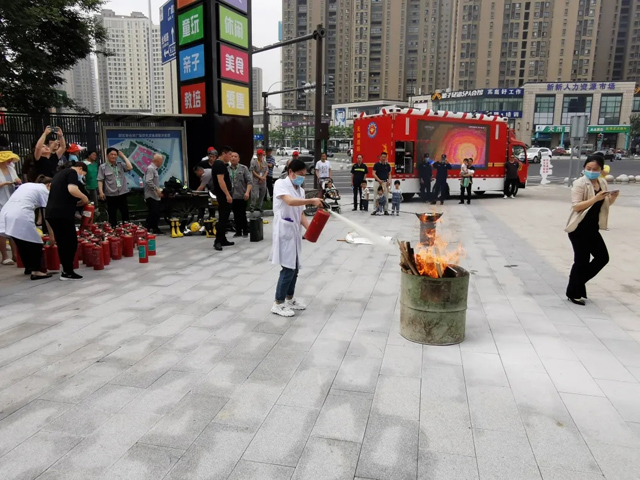 全體人員疏散至廣場中心集合,進行滅火器滅火實操演練,“拔掉保險銷,一只手握住噴嘴,另一只手下壓手柄,距離火源1.2—1.5米左右,順風(fēng)向?qū)驶鹧娓繃娚洹?,每位參加員工都能按照操作要領(lǐng),成功撲滅火源。