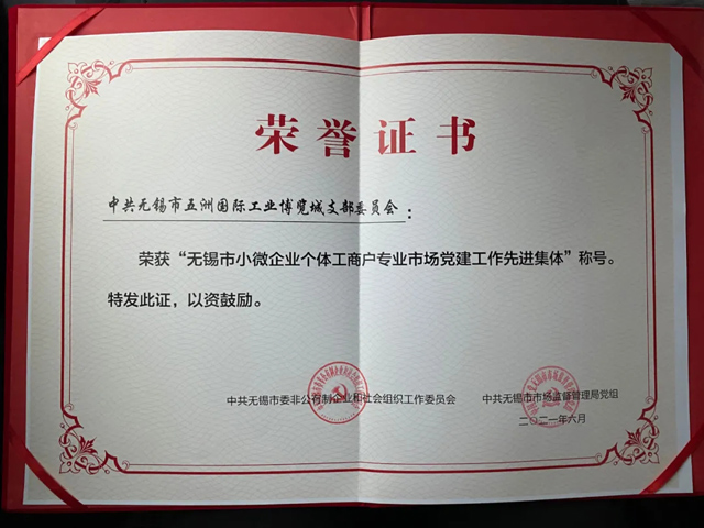 無錫五洲國際工業(yè)博覽城黨支部成立于2011年,立足市場,根據(jù)自身非公制黨支的特性,推動(dòng)基層黨組織規(guī)范,標(biāo)準(zhǔn)化建設(shè),曾被評為“ 全國商品交易市場黨建示范單位 ”。在抗擊新冠疫情期間,更是充分發(fā)揮了基層黨組織戰(zhàn)斗堡壘作用和黨員先鋒模范作用,榮獲了戰(zhàn)“疫”一線先進(jìn)基層黨組織等殊榮。