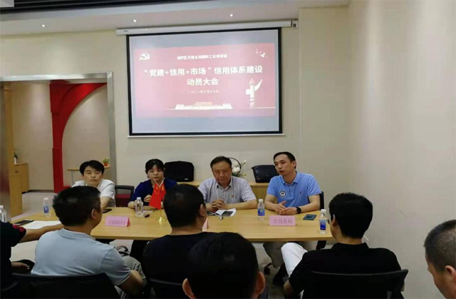 章永星執(zhí)行會長首先對此次活動做了動員,就為什么選在五洲工博城開展“黨建+信用+市場”信用體系建設(shè)試點作了說明,他指出今年是中國共產(chǎn)黨成立100周年,協(xié)會和工博城要以黨建為引領(lǐng),堅持新發(fā)展理念,圍繞確保商品質(zhì)量、提升服務(wù)品質(zhì)、堅持誠信經(jīng)營和突出社會貢獻四項任務(wù),發(fā)揮黨員的先進模范作用,來推進市場有益、有序、健康、可持續(xù)發(fā)展,高標(biāo)準(zhǔn)打造“知信、用信、守信”的社會信用體系建設(shè)示范市場并形成模式,然后在其他市場進行推廣。