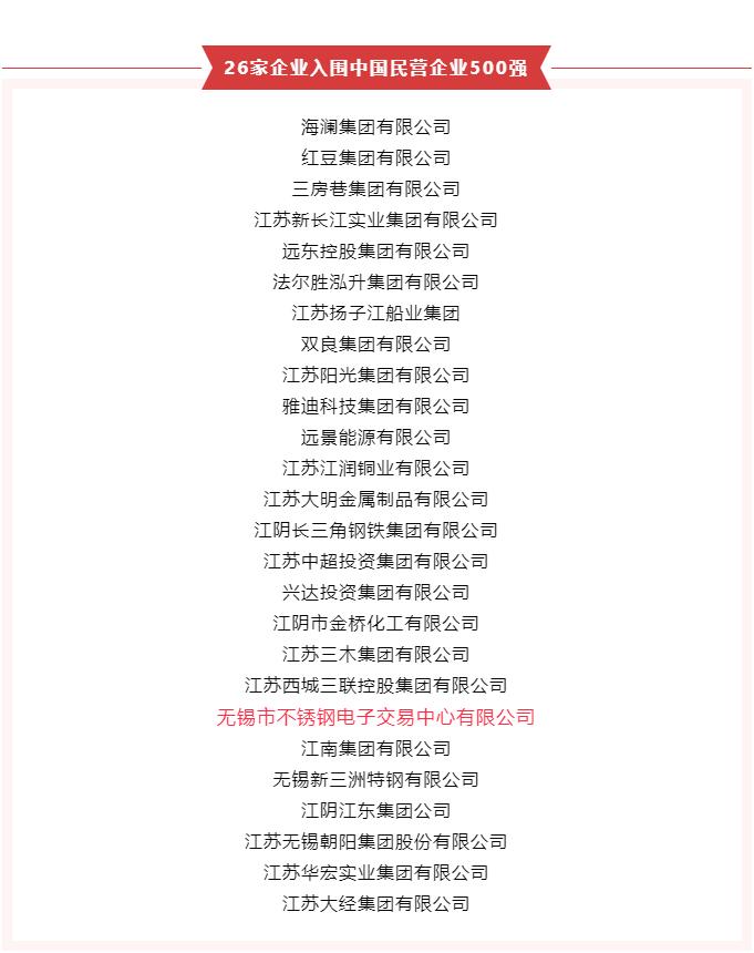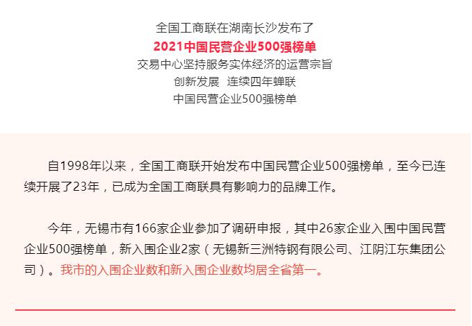 無錫市不銹鋼交易中心蟬聯(lián)2021中國民營企業(yè)500強(qiáng)榜單