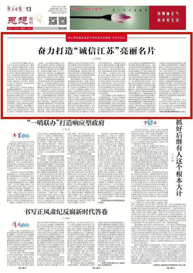 12月7日,新華日報《思想周刊》刊發(fā)了江蘇省發(fā)展改革委黨組書記、主任李侃楨的署名文章《奮力打造“誠信江蘇”亮麗名片》,全文如下: