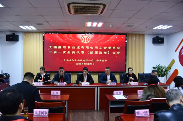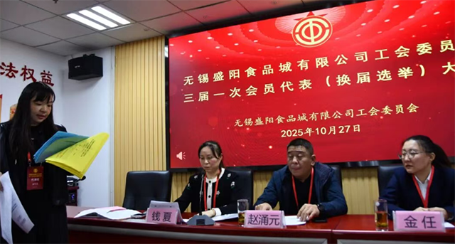 一步加強行業(yè)工會建設,健全工會組織,確保無錫盛陽食品城有限公司工會委員會各項工作的順利開展,經(jīng)盛陽職工工會二屆四次全委會決議,報備梁溪區(qū)水產(chǎn)行業(yè)工會聯(lián)合會并獲批準,2025年10月27日上午,盛陽職工工會三屆一次會員代表(換屆選舉)大會在盛陽食品城8號樓三樓多功能會議室隆重召開。會議由職工工會婦工委主任錢夏同志主持。