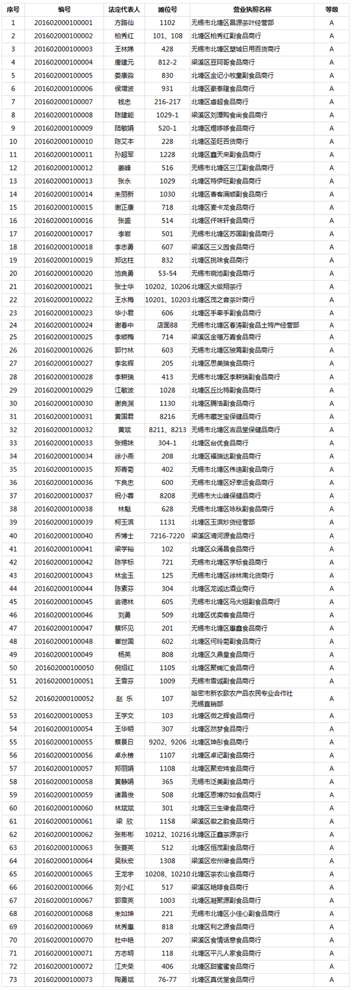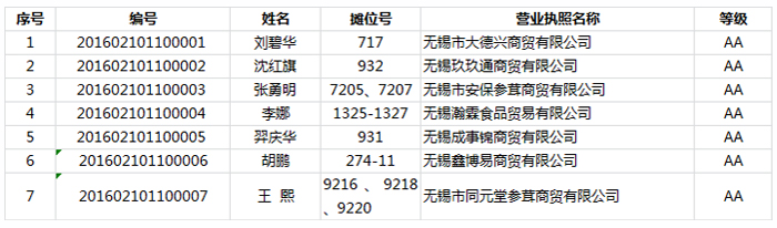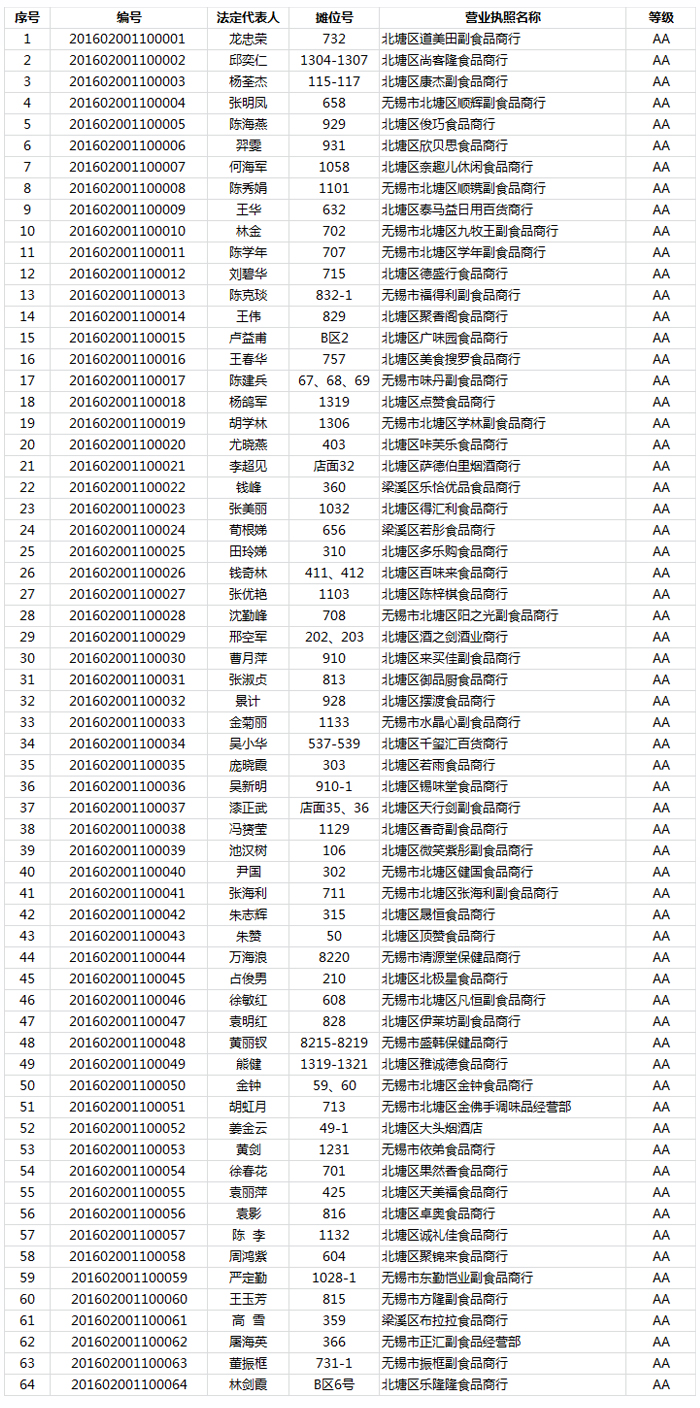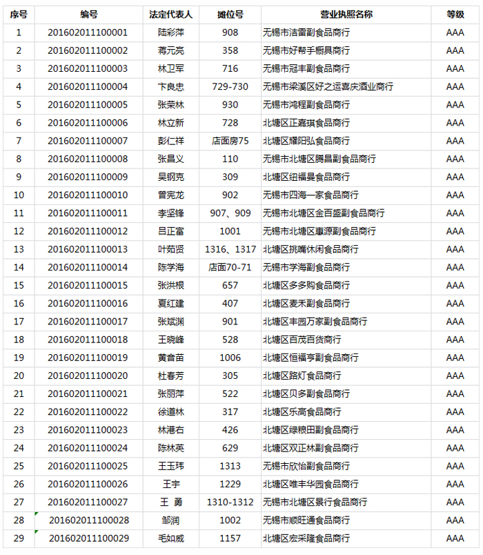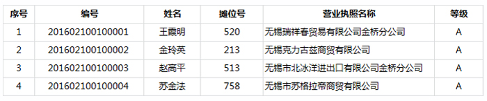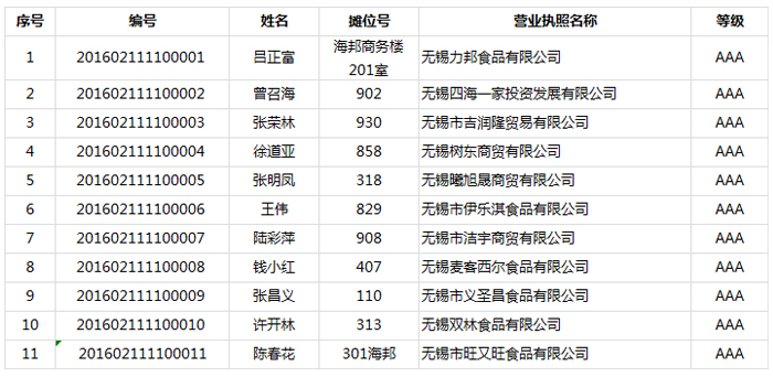 2016年金橋副食品市場商務(wù)誠信評級企業(yè)名單匯總表