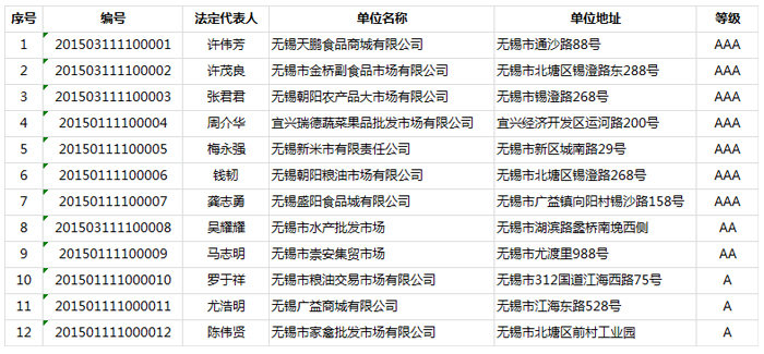 2015年農(nóng)副產(chǎn)品市場商務(wù)誠信評級名單