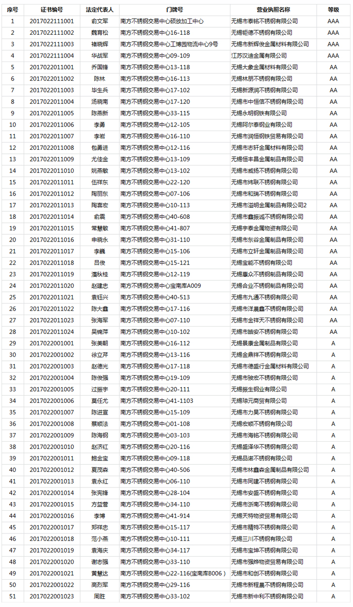 2017年南方不銹鋼市場商務誠信評級試點結果名單