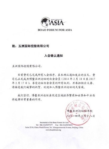 近日,五洲國際控股有限公司正式成為博鰲亞洲論壇白金會員,并獲邀出席于今年4月8日——4月11日在海南舉辦的博鰲亞洲論壇2014年年會,今年的會議主題是“亞洲的新未來:尋找和釋放新的發(fā)展動力”。