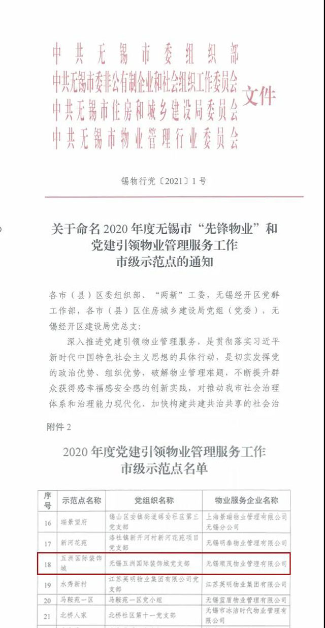 為深入推進黨建引領物業(yè)管理服務工作,推動無錫市社會治理體系和治理能力現(xiàn)代化,日前,中共無錫市委組織部、無錫市住房和城鄉(xiāng)建設局委員會等部門對“黨建引領物業(yè)管理服務工作市級示范點”進行評定,無錫五洲國際裝飾城獲評此項榮譽稱號。