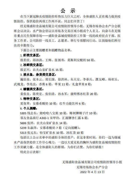 “急難有情 情有馀兮”。為此,經(jīng)無錫盛陽食品城有限公司疫情防控領(lǐng)導(dǎo)小組、無錫市場協(xié)會水產(chǎn)分會聯(lián)席會議決議:水產(chǎn)協(xié)會倡議以市場各交易區(qū)域小組或個人名義,向奮斗在無錫市重點(diǎn)民生保障市場——盛陽食品城疫情防控工作第一線的政府駐點(diǎn)干部、醫(yī)務(wù)工作者、公司防控一線員工、志愿者,舉行專項(xiàng)慰問行動,以鼓勵他們所付出的辛勤努力。