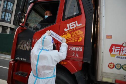 時間,對于貨運司機來說何其寶貴,這也讓他們很多人顧不上休息和吃飯,夜以繼日地趕路。車輛核驗過程中,專班成員密切關(guān)注貨運司機及運輸貨物情況,還給每位司機準備了愛心物資包,包含水、方便食品、口罩、消毒液等,針對長途司機的物資包中還貼心準備了拖鞋、襪子、洗漱用品、衛(wèi)生用品等。市商務局和梁溪區(qū)市場監(jiān)管局駐點保供人員將物資一一發(fā)放到貨運司機手中??吹接行┧緳C狀態(tài)不佳,詢問得知已經(jīng)20多個小時沒吃飯,專班成員立即把自己還沒來得及開動的盒飯送到司機師傅手中,師傅們感動地熱淚盈眶??吹截涍\車輛運輸?shù)氖巧i、海鮮等貨物時,專班立即進行調(diào)配,引導車輛前往快速通道優(yōu)先通行,最大程度降低物流耗損,保障市場充分穩(wěn)定供應。