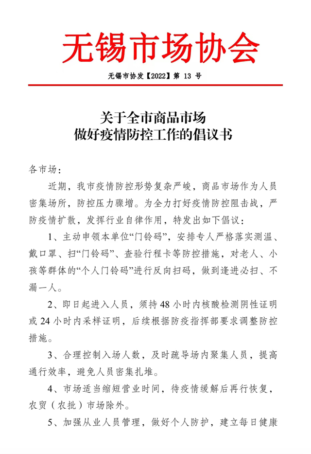 關(guān)于全市商品市場(chǎng)做好疫情防控工作的倡議書