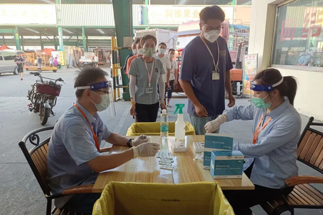 自疫情開始以來(lái),朝陽(yáng)股份就實(shí)行“抗原檢測(cè)+核酸檢測(cè)”的防控手段,即市場(chǎng)人員抗原檢測(cè)一天兩檢,入場(chǎng)會(huì)員一天一檢。7月4日起,朝陽(yáng)股份調(diào)集骨干員工,深入蔬菜市場(chǎng)、水果市場(chǎng)各個(gè)大棚,設(shè)立抗原檢測(cè)點(diǎn),以便市場(chǎng)所有人員能在第一時(shí)間完成篩查,并如期完成當(dāng)天核酸檢測(cè)。
