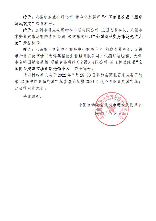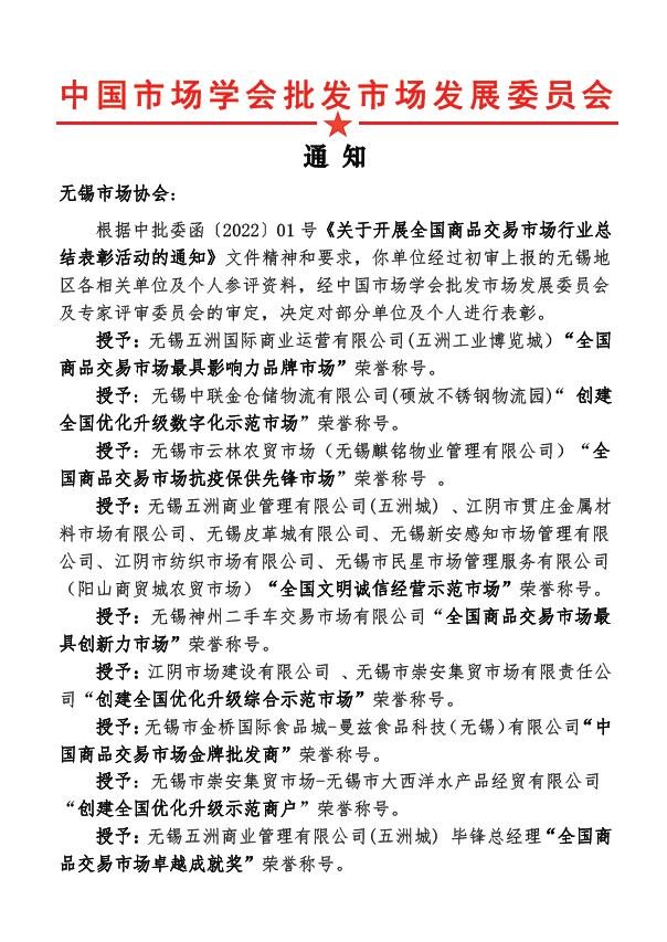 喜報-中國市場學會批發(fā)市場發(fā)展委員會表彰通知