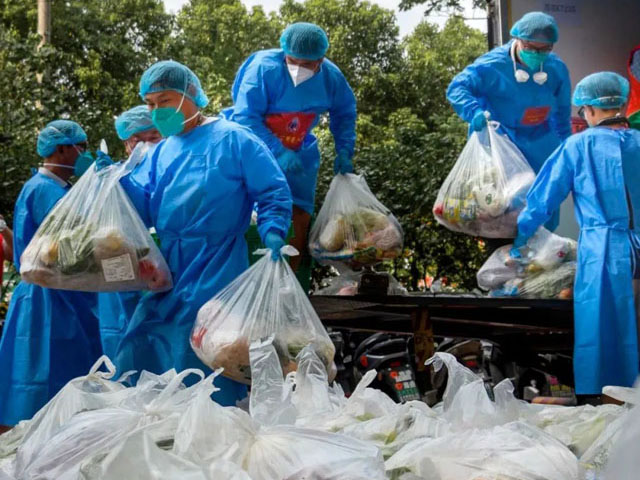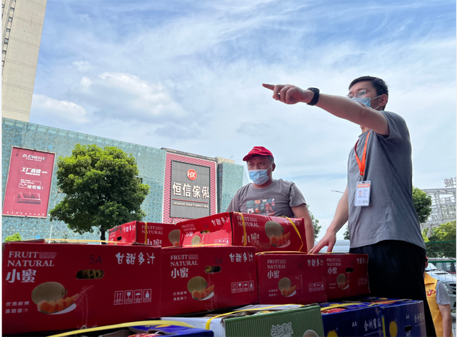 傍晚,十多輛滿載著希望與力量的貨車緩緩駛進(jìn)五洲工博城門崗,各路志愿者們?cè)缫逊峙涞礁鲘?。?duì)于五米陽光的居民來說,這是一個(gè)極具儀式感的時(shí)刻。
