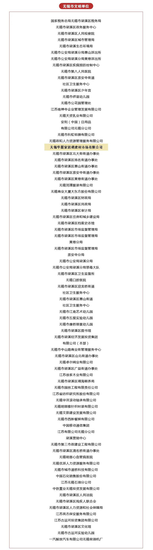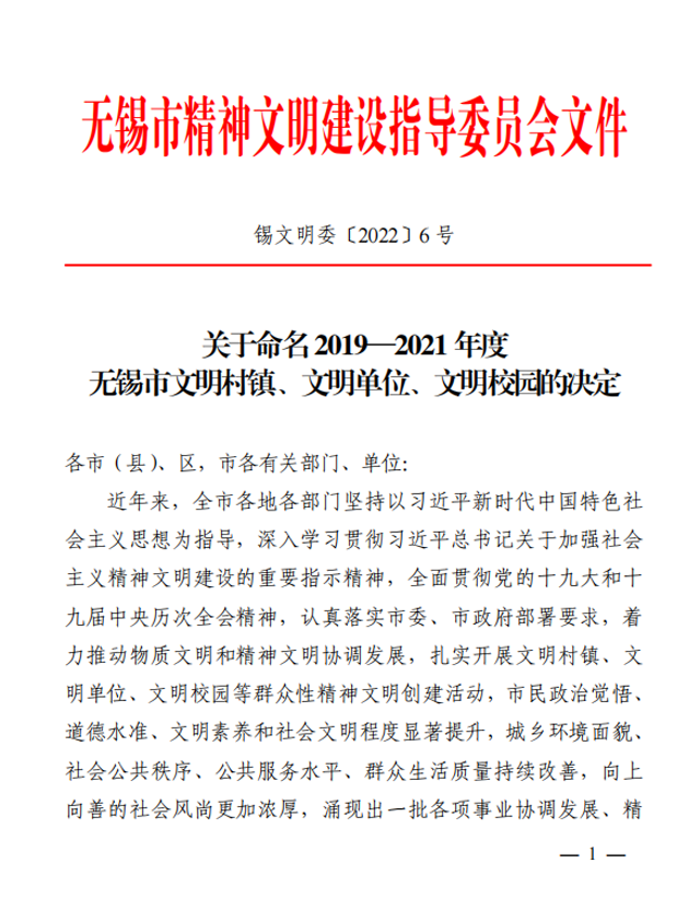 近日,根據(jù)無(wú)錫市精神文明建設(shè)指導(dǎo)委員會(huì)下發(fā)《關(guān)于命名2019—2021年度無(wú)錫市文明村鎮(zhèn)、文明單位、文明校園的決定》(錫文明委〔2022〕6號(hào)),無(wú)錫華廈家居港建材市場(chǎng)有限公司被授予 2019-2021年度“無(wú)錫市文明單位”稱(chēng)號(hào)。