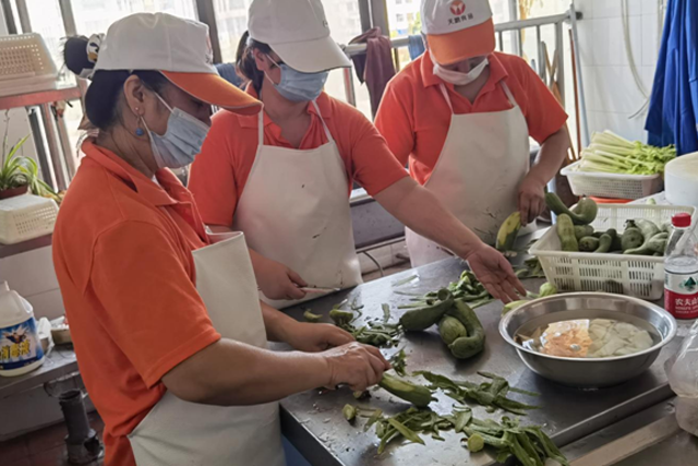 奮戰(zhàn)在后勤崗位的廚師和服務(wù)團隊,為了保障四五百人的午餐供應(yīng),每天都在高強度地連軸轉(zhuǎn)。早上八點到九點半,是切配阿姨們最忙碌的時段,她們每天要處理兩百多斤的食材,為大廚們“打好前戰(zhàn)”。