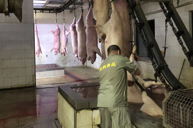 “夜熱依然午熱同”,近期持續(xù)的高溫天氣讓本該涼爽的夜晚也充斥的一股股熱浪。凌晨1點,屠宰車間的工作人員早已到位準(zhǔn)備作業(yè),隨著懸掛輸送設(shè)備緩緩?fù)七M,豬身清洗、刺殺放血、浸燙刮毛、開膛取臟、割身劈半、沖淋復(fù)檢、割肉入庫等生豬屠宰工序依次完成。十幾位工作人員各司其職,接受熱浪席卷的同時依然“熱情”不減,高度關(guān)注機器運行狀況,規(guī)范完成各個屠宰工序,拉足馬力為市民供應(yīng)安全放心的鮮肉。