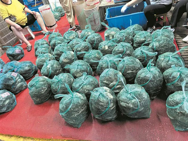 無錫盛陽水產(chǎn)批發(fā)市場是錫城最大的蟹類批發(fā)市場。記者昨天早上在市場看到,經(jīng)營戶們正忙著分蟹或“纏足”,一捆捆不同克重的蟹整齊碼在一邊待售。