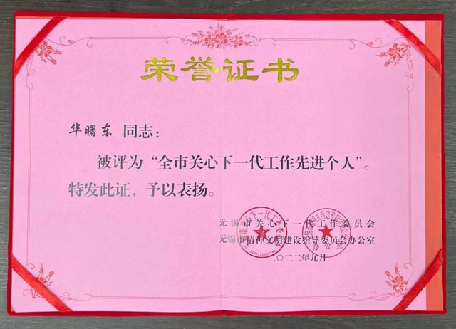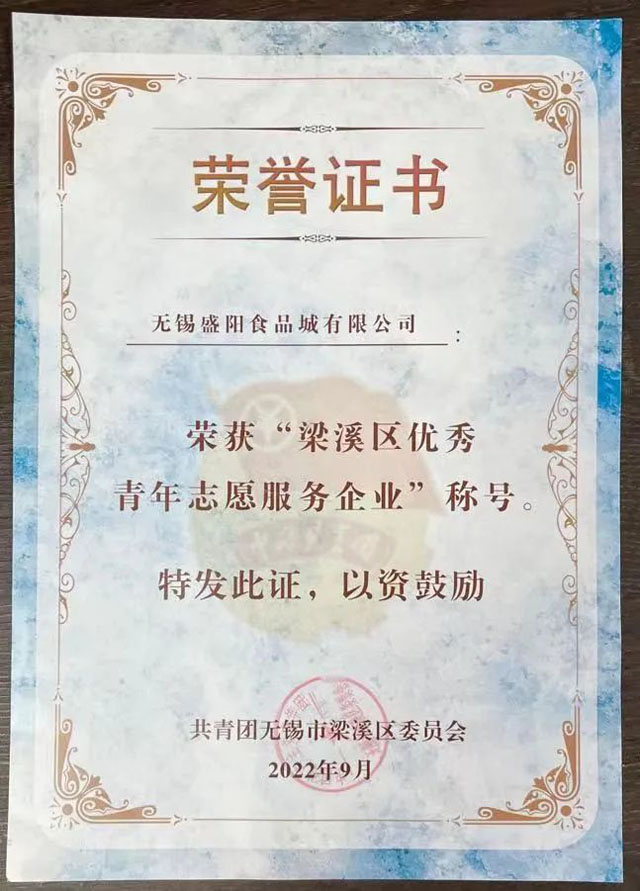 2022年9月,盛陽食品城榮獲了由無錫市關(guān)心下一代工作委員會(huì)授予的“全市關(guān)心下一代工作標(biāo)桿企業(yè)”榮譽(yù)稱號。此項(xiàng)榮譽(yù)的獲得,是對盛陽食品城關(guān)工委在市、區(qū)、街道關(guān)工委的關(guān)懷、指導(dǎo)下和公司董事長龔志勇的鼎力支持下,在強(qiáng)化黨建引領(lǐng)、堅(jiān)持立德樹人,注重問題導(dǎo)向、創(chuàng)新思路舉措等方面開展的關(guān)心下一代工作中取得的新成效的肯定。與此同時(shí),盛陽食品城黨支部書記、常務(wù)副總、關(guān)工委主任華曙東同志,榮獲了由無錫市關(guān)心下一代工作委員會(huì)、無錫市精神文明建設(shè)指導(dǎo)委員會(huì)辦公室授予的“無錫市關(guān)心下一代工作先進(jìn)個(gè)人”榮譽(yù)稱號。
