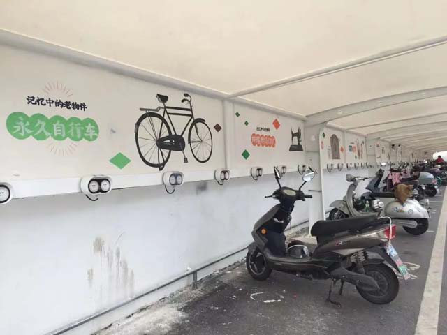集市大門靠墻的一排車棚內(nèi),每個車位前都安裝有充電插頭,十分貼心;抬頭一看,墻繪“永久自行車”“蝴蝶牌縫紉機”“三五牌座鐘”,充滿了溫暖的生活記憶。來到集市入口,掃描個人門鈴碼進入市場,只見墻上的電子屏滾動顯示著菜價、人流量及檢疫信息。