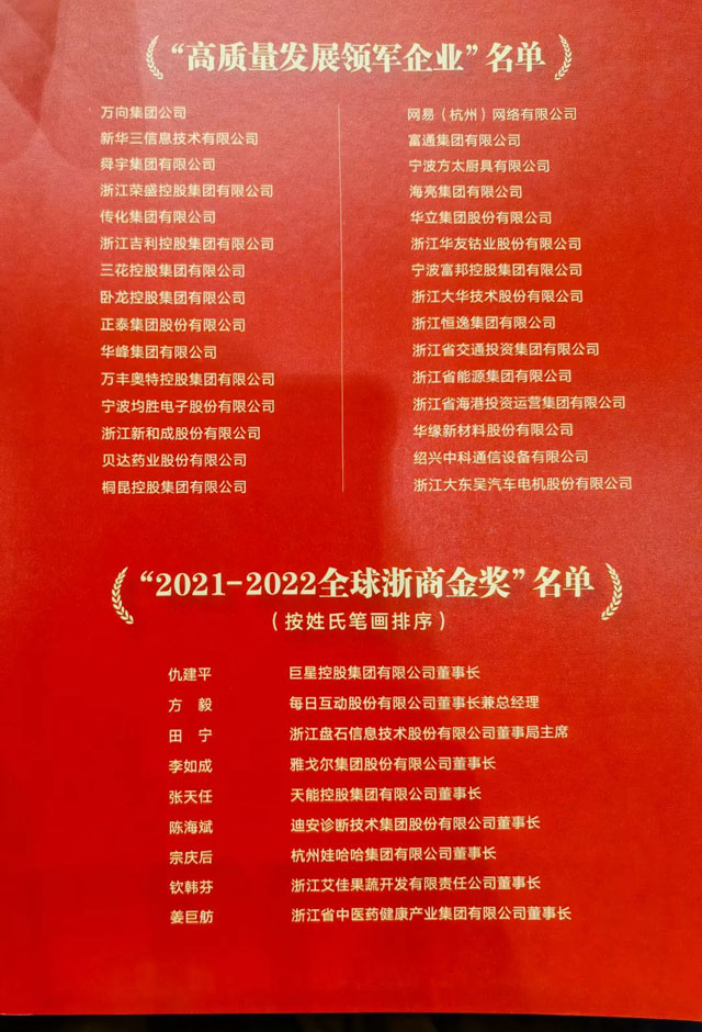 本屆大會推廣了一批服務浙商的重大數(shù)字應用平臺,展現(xiàn)浙江省委、省政府以數(shù)字化改革為牽引,全力打造一流營商環(huán)境的鮮明態(tài)度和有力舉措。表彰“高質(zhì)量發(fā)展領(lǐng)軍企業(yè)”,頒發(fā)“2021—2022全球浙商金獎”,大力弘揚企業(yè)家精神和新時代浙商精神。