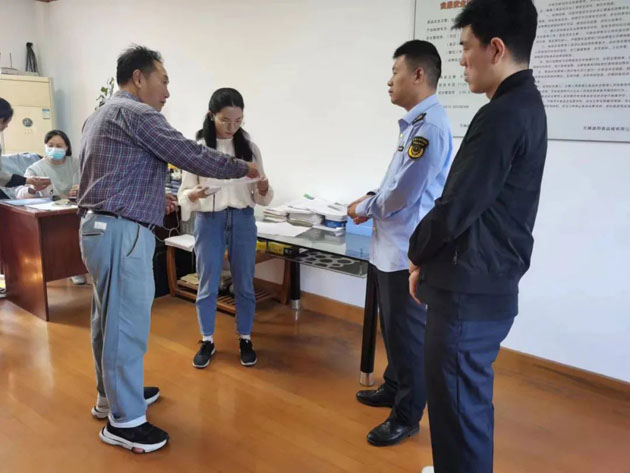 民以食為天,食以安為先,農(nóng)產(chǎn)品批發(fā)市場是保障“菜籃子”供應(yīng)和餐桌安全的重要場所,食品安全關(guān)系到人民身體健康和社會和諧穩(wěn)定。由于此前8月份江蘇省食用農(nóng)產(chǎn)品批發(fā)市場第三方食品安全風(fēng)險隱患排查,對盛陽食品城的食安工作提出了整改意見,因此,為確保問題整改到位,并進一步推動企業(yè)有效落實食品安全主體責(zé)任,助力企業(yè)強化食品安全風(fēng)險防控能力,完善食品安全責(zé)任體系,促進食品產(chǎn)業(yè)高質(zhì)量發(fā)展,2023年10月12日上午10點,梁溪區(qū)市場監(jiān)督管理局食品經(jīng)營安全監(jiān)督管理科科長鄭舒、市監(jiān)局廣益分局副局長張慶余等一行四人來到盛陽食品城進行食品安全專項檢查,盛陽食品城運營板塊負(fù)責(zé)人馮敏、食品安全主管錢夏全程參與檢查組的專項檢查工作。