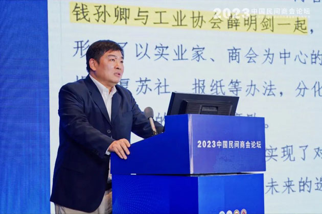 盧勇作題為“商會(huì)的壯大才能匹配民營(yíng)經(jīng)濟(jì)的發(fā)展壯大”的報(bào)告。他指出,黨的二十大首次明確提出“促進(jìn)民營(yíng)經(jīng)濟(jì)發(fā)展壯大”。雖然民營(yíng)經(jīng)濟(jì)貢獻(xiàn)了我國(guó)大部分的稅收、GDP、創(chuàng)新成果和就業(yè),但是其高質(zhì)量發(fā)展水平、創(chuàng)新水平和有序發(fā)展水平仍有待加強(qiáng)。商會(huì)在促進(jìn)民營(yíng)經(jīng)濟(jì)發(fā)展壯大的事業(yè)中角色至關(guān)重要,商會(huì)的壯大才能匹配民營(yíng)經(jīng)濟(jì)的發(fā)展壯大。然而在中國(guó),商會(huì)在數(shù)量上不多、單位組織不大、基礎(chǔ)能力不強(qiáng)、擔(dān)當(dāng)意識(shí)不夠,企業(yè)影響力不足、新型政會(huì)關(guān)系仍未有效建立。他提出,應(yīng)對(duì)商會(huì)性質(zhì)、商會(huì)職能、會(huì)員發(fā)展、辦公場(chǎng)所、經(jīng)費(fèi)來源等予以進(jìn)一步規(guī)范和保證,致力將商會(huì)打造為政府政策法規(guī)的“傳聲筒”、企業(yè)意見訴求的“集成器”、市場(chǎng)發(fā)展變化的“感應(yīng)器”、民營(yíng)經(jīng)濟(jì)發(fā)展壯大的“助推手”,努力培育壯大商會(huì)從而促進(jìn)民營(yíng)經(jīng)濟(jì)發(fā)展壯大。