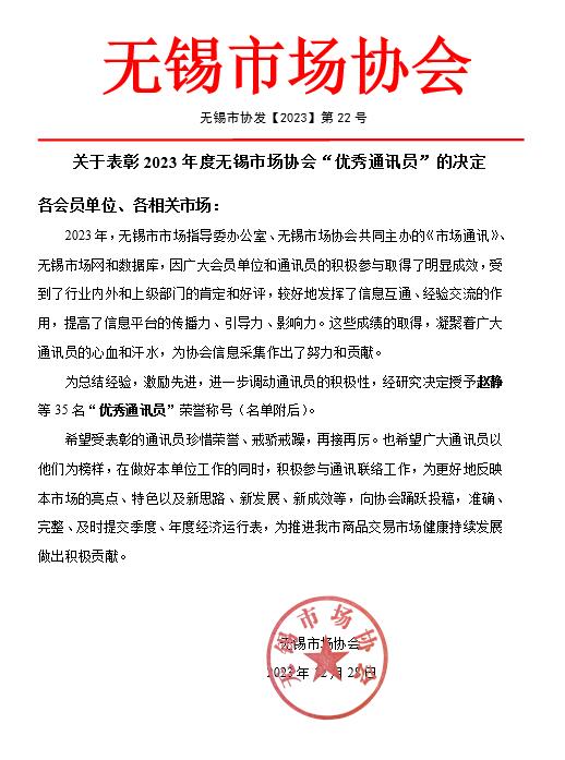 無(wú)錫市協(xié)發(fā)【2023】第22號(hào) 關(guān)于表彰2023年度無(wú)錫市場(chǎng)協(xié)會(huì)“優(yōu)秀通訊員”的決定