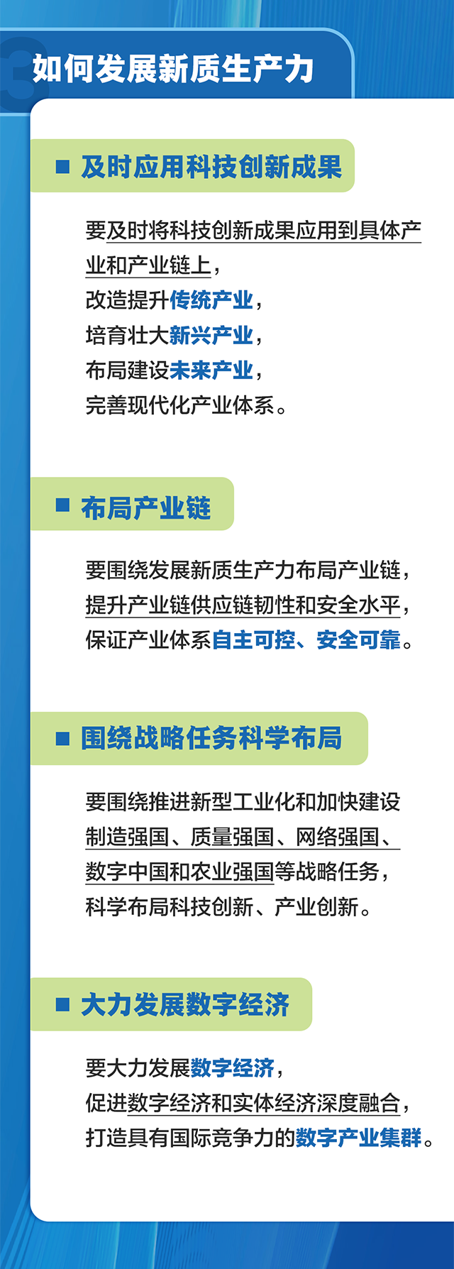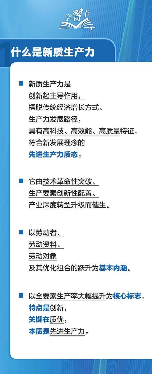 2023年9月,習(xí)近平總書記在黑龍江考察調(diào)研期間首次提到“新質(zhì)生產(chǎn)力”。2024年1月31日,習(xí)近平在中共中央政治局第十一次集體學(xué)習(xí)時強(qiáng)調(diào),加快發(fā)展新質(zhì)生產(chǎn)力,扎實(shí)推進(jìn)高質(zhì)量發(fā)展。總書記指出,高質(zhì)量發(fā)展需要新的生產(chǎn)力理論來指導(dǎo),而新質(zhì)生產(chǎn)力已經(jīng)在實(shí)踐中形成并展示出對高質(zhì)量發(fā)展的強(qiáng)勁推動力、支撐力,需要我們從理論上進(jìn)行總結(jié)、概括,用以指導(dǎo)新的發(fā)展實(shí)踐。什么是新質(zhì)生產(chǎn)力,如何指導(dǎo)新的發(fā)展實(shí)踐,總書記作了詳細(xì)闡釋,一起學(xué)習(xí)↓