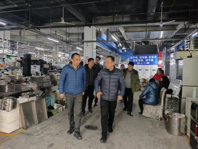 2024年2月29日下午,無錫市場協(xié)會執(zhí)行會長章永星、秘書長楊四方攜秘書處工作人員,陪同無錫市商務局商貿流通處處長蔣仲征等一行4人,來到無錫舊貨市場,與總經理吳錫秋,就組織申報“在全國范圍培育一批廢舊家電家具等再生資源回收體系典型城市和典型企業(yè)”工作,開展調研考察并座談交流。