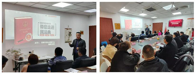 會(huì)議第一部分,江蘇仁勤律師事務(wù)所陸耀忠主任為與會(huì)人員進(jìn)行《民法典》相關(guān)法律知識(shí)培訓(xùn),圍繞認(rèn)識(shí)《民法典》、總則編、物權(quán)編、合同編、人格權(quán)編、婚姻家庭編、繼承編、侵權(quán)責(zé)任編等8項(xiàng)內(nèi)容進(jìn)行了簡(jiǎn)要介紹,并通過(guò)關(guān)鍵詞“平等、忠誠(chéng)、綠色、法人”,以及自己的從業(yè)經(jīng)驗(yàn)和現(xiàn)實(shí)案例,為大家上了一趟印象深刻的民法知識(shí)普及課。