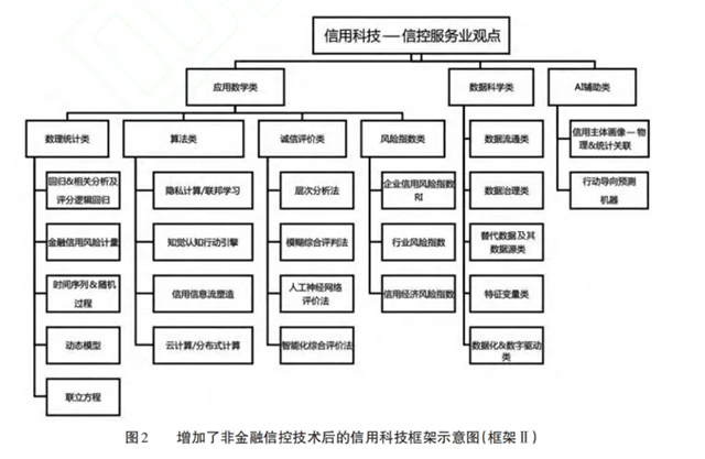 對(duì)于信用科技框架內(nèi)應(yīng)該包含什么樣的技術(shù)和工具,信控服務(wù)業(yè)考慮更為廣泛,特別是其中的征信、信用評(píng)級(jí)和誠(chéng)信評(píng)價(jià)等行業(yè)分支。該行業(yè)的服務(wù)業(yè)者認(rèn)為,應(yīng)該將一些非金融的信控技術(shù)和工具納入信用科技框架,其觀點(diǎn)如圖2所描述。