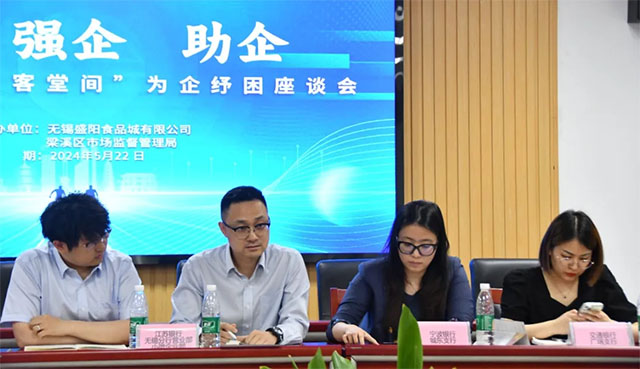 無(wú)難事、悉心辦,進(jìn)一步聚焦惠企政策和企業(yè)間信息不對(duì)稱、企業(yè)生產(chǎn)經(jīng)營(yíng)中的監(jiān)管難題、融資痛點(diǎn)等,2024年5月16日,由市市場(chǎng)監(jiān)管局、市人社局、中國(guó)人民銀行無(wú)錫市分行、市稅務(wù)局、市工商聯(lián)聯(lián)合在全市設(shè)點(diǎn)十個(gè)“營(yíng)商客堂間”,多部門(mén)圍繞企業(yè)的高頻辦事需求,通過(guò)一個(gè)訴求解決一類問(wèn)題,讓在錫企業(yè)“引進(jìn)來(lái)、留得住、發(fā)展好”。無(wú)錫市水產(chǎn)業(yè)專業(yè)合作協(xié)會(huì)作為梁溪區(qū)首批入選對(duì)接協(xié)會(huì)被光榮設(shè)為了十個(gè)“營(yíng)商客堂間”之一。5月22日下午,在市水產(chǎn)業(yè)專業(yè)合作協(xié)會(huì)的積極對(duì)接下,無(wú)錫市市場(chǎng)監(jiān)督管理局、梁溪區(qū)市場(chǎng)監(jiān)督管理局、區(qū)市監(jiān)局廣益一分局、廣益街道經(jīng)發(fā)局等多個(gè)監(jiān)管部門(mén)多位領(lǐng)導(dǎo)攜寧波銀行城東支行、交通銀行廣瑞支行、江蘇銀行無(wú)錫分行三家銀行相關(guān)負(fù)責(zé)人來(lái)到協(xié)會(huì)會(huì)長(zhǎng)單位——無(wú)錫盛陽(yáng)食品城有限公司開(kāi)展“穩(wěn)企強(qiáng)企助企 水產(chǎn)行業(yè)‘營(yíng)商課堂間’為企紓困座談會(huì)”。會(huì)議在盛陽(yáng)食品城8號(hào)樓三樓多功能會(huì)議室召開(kāi)。市水產(chǎn)業(yè)專業(yè)合作協(xié)會(huì)會(huì)長(zhǎng)、盛陽(yáng)總經(jīng)理龔志勇,盛陽(yáng)黨支部書(shū)記、常務(wù)副總?cè)A曙東,盛陽(yáng)總經(jīng)理助理、運(yùn)營(yíng)板塊負(fù)責(zé)人馮敏,盛陽(yáng)易鮮達(dá)科技有限公司副總侯丹花,盛陽(yáng)市場(chǎng)內(nèi)無(wú)錫市若銘水產(chǎn)商貿(mào)有限公司、崇安區(qū)老錢(qián)水產(chǎn)品商行、崇安區(qū)廣益街道張良水產(chǎn)商行等9家具有代表性的個(gè)體經(jīng)營(yíng)戶以及2位進(jìn)銷戶參加了會(huì)議。會(huì)議由區(qū)市監(jiān)局廣益一分局分局長(zhǎng)楊順文主持。
