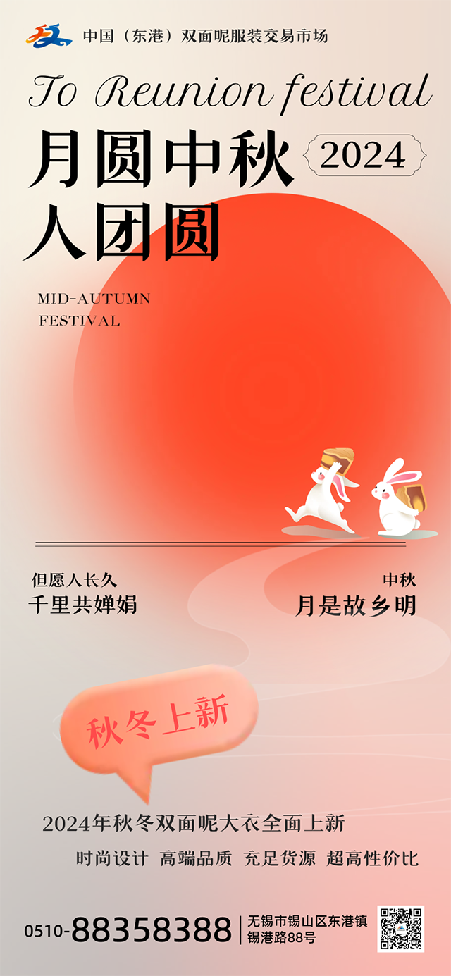 秋風(fēng)送爽好時(shí)節(jié),丹桂飄香迎中秋!中國(guó)(東港)雙面呢服裝交易市場(chǎng)祝所有的商戶(hù)、員工、采購(gòu)商朋友闔家團(tuán)圓,幸福美滿(mǎn)!
